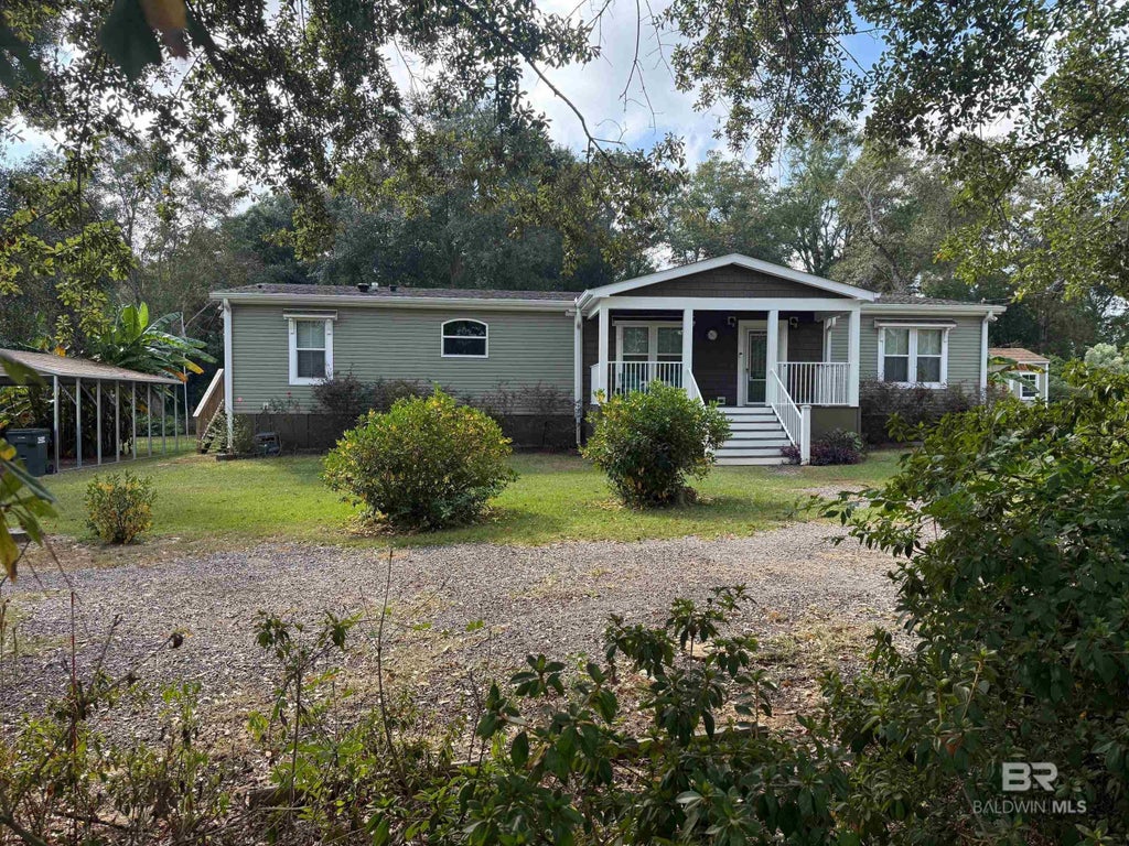 Experience affordable luxury at 26126 Joe Foley Road. This 2019 Sunshine model offers 1,980 sq. ft. of open-concept living on a generous 0.67-acre lot. Designed with modern upgrades throughout, the home features 3 bedrooms, 2 bathrooms, and a perfect blend of style and functionality. The chef-inspired kitchen shines with custom cabinetry, an oversized 8-foot island, and premium Samsung appliances—ideal for everyday living and entertaining. The primary suite is a private retreat, complete with a spacious 4’x6’ walk-in shower and dressing room. Step outside to a true backyard oasis: a 16’x24’ covered porch with ceiling fans, a 65” TV, and propane grill—perfect for year-round gatherings. Fruit trees, an herb garden, and a 20-foot Conex unit add extra charm and convenience. Additional highlights include ultra-efficient utilities, a 9kW dual-fuel generator, and a desirable Flood Zone X location. With no zoning restrictions and annual taxes under $325, this property delivers exceptional value and flexibility in the heart of Robertsdale. Buyer to verify all information during due diligence.